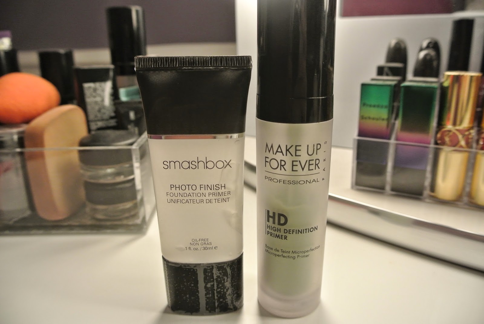 1. I use two primers. My face has redness so I use this green goopy stuff from Makeup Forever to get rid of the redness. The Smashbox primer is used on top to cover up my pores (which you could otherwise see from space).